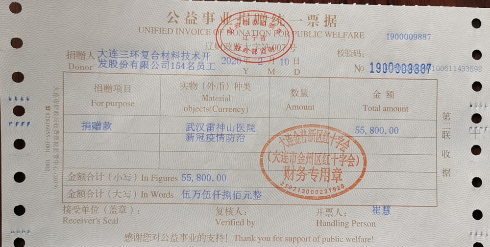 三環(huán)復(fù)材積極響應(yīng)政府號(hào)召,在做好企業(yè)內(nèi)部安全防護(hù)、關(guān)愛(ài)保護(hù)員工的同時(shí),向疫情重災(zāi)區(qū)的人們伸出援手,正所謂“一方有難、八方支援”。經(jīng)董事會(huì)決議,以公司名義向武漢捐贈(zèng)10萬(wàn)元資金,并組織全體員工為抗擊疫情義務(wù)捐款募集資金5.58萬(wàn)元,合計(jì)善款15.58萬(wàn)元!我們通過(guò)大連市金普新區(qū)紅十字會(huì)將此筆善款全部定向用于“武漢雷神山醫(yī)院新型冠狀病毒感染的肺炎疫情防治”,以此奉獻(xiàn)我們的微薄力量。